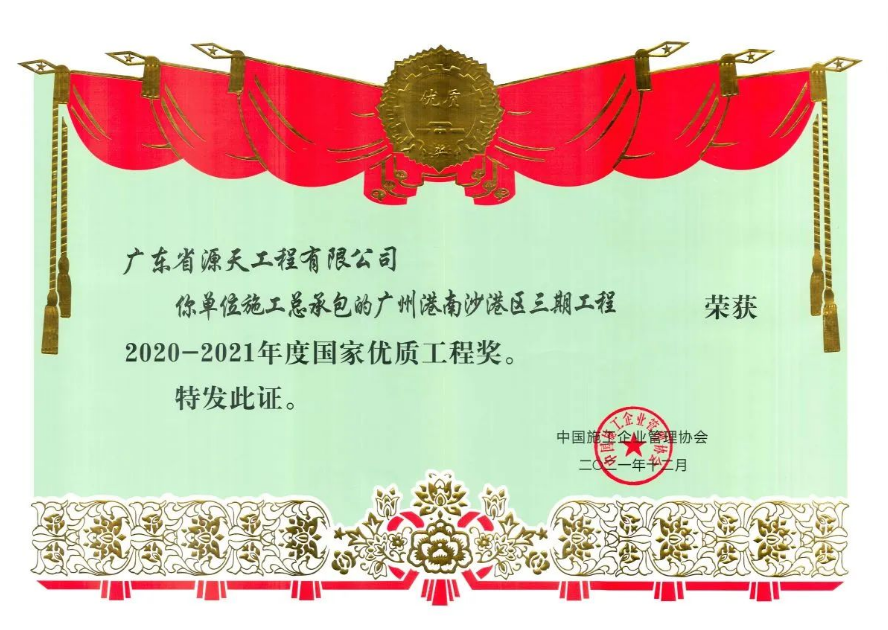 公司荣誉奖项繁多,在项目管理过程中,源天人坚持“做一个工程,拓一方市场,交一方朋友,树一座丰碑”的愿景,严格质量标准、坚持科技创新、实施科学管理。多个工程获得社会各界的一致好评,多次被授予鲁班奖、大禹奖、詹天佑奖、国家优质工程、全国市政金杯示范工程等多项国家、省部级奖项。连续27年获得“广东省守合同重信用企业”称号;并获得了“全国建筑业AAA级信用企业”、“全国水利行业AAA级信用企业”、“全国电力行业AAA级信用企业”、“全国水利安全生产标准化一级单位”、“全国优秀水利企业”以及“广东省自主创新标杆企业”、“广东省企业500强”、“广东省高新技术企业”、“省级企业技术中心”等称号。